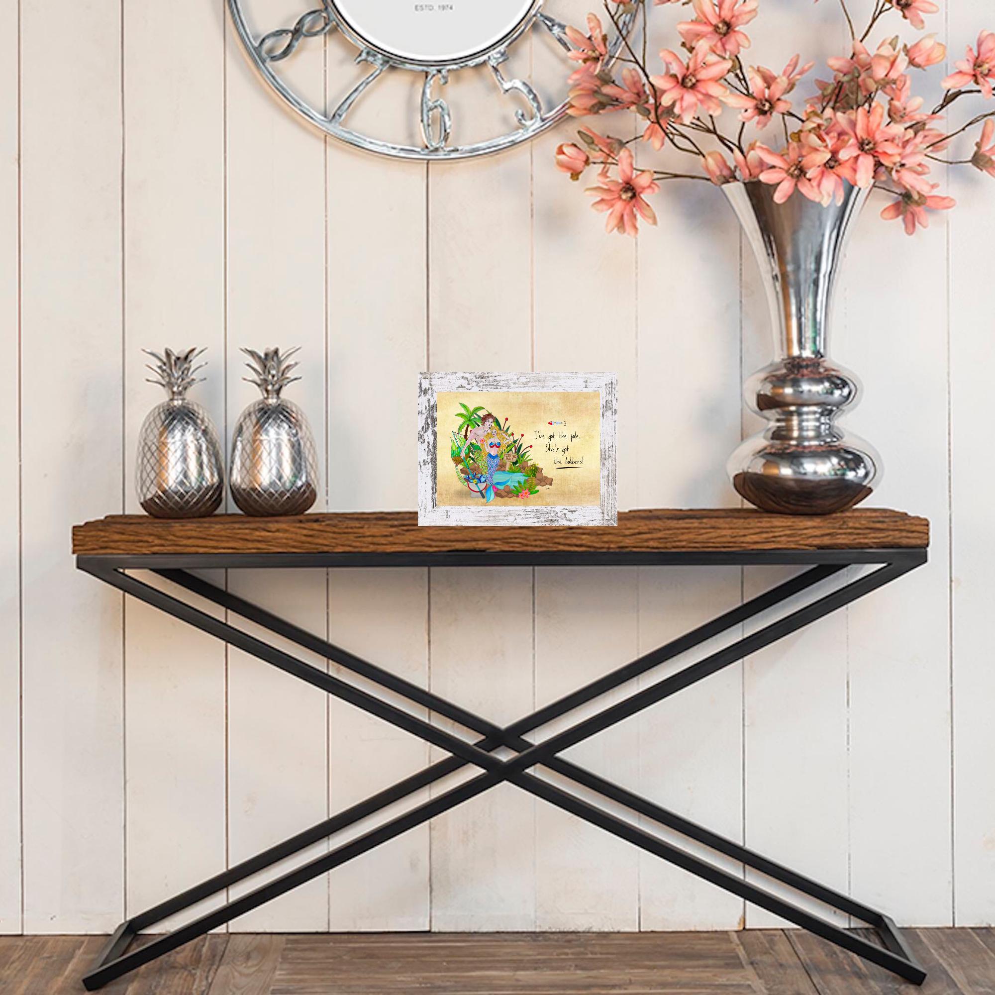 The large print measures 10 X 8. It comes displayed in a one-inch white distressed frame with glass, making the overall dimension 12” X 10”. This framed print can be hung on a wall or will sit on a tabletop.